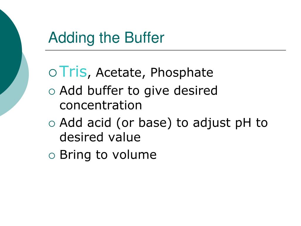 Adding the Buffer • Tris, Acetate, Phosphate • Add buffer to give desired concentration • Add acid (or base) to adjust pH to desired value • Bring to volume