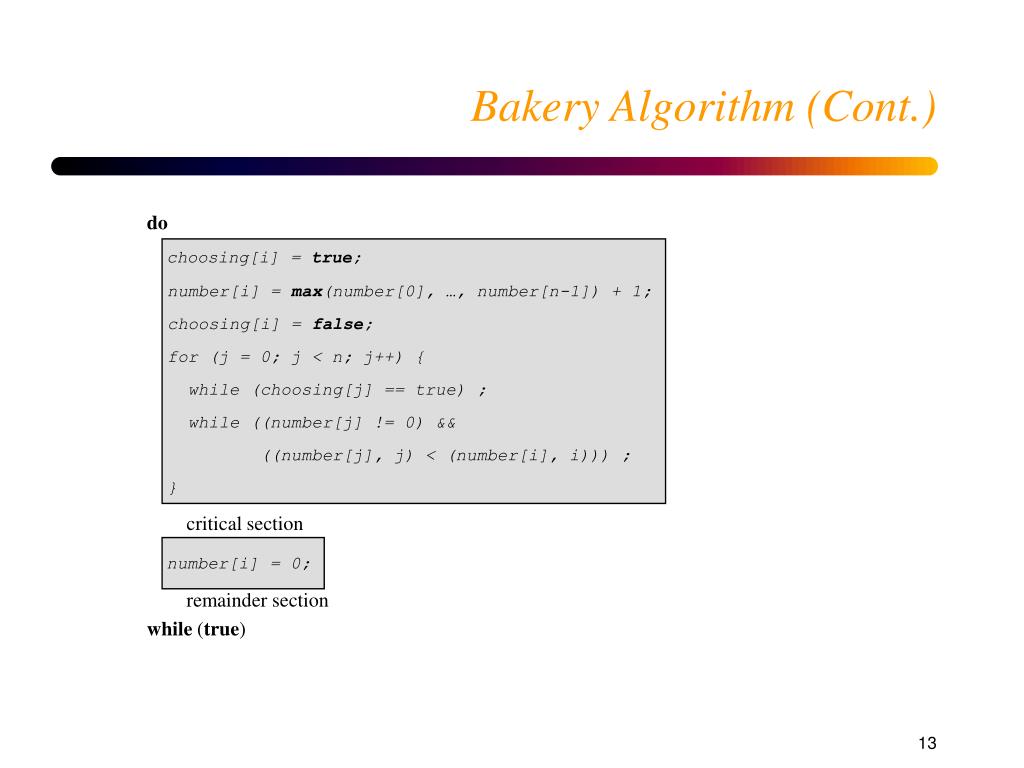 Bakery Algorithm (Cont.) do choosing[i] = true; number[i] = max(number[0], …, number[n-1]) + 1; choosing[i] = false; for (j = 0; j < n; j++) { while (choosing[j] == true) ; while ((number[j] != 0) && ((number[j], j) < (number[i], i))) ; } critical section number[i] = 0; remainder section while (true)
