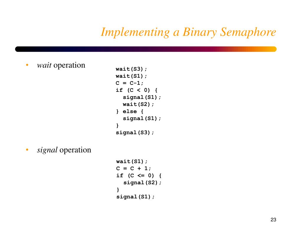 Implementing a Binary Semaphore • wait operation • signal operation wait(S3); wait(S1); C = C-1; if (C < 0) { signal(S1); wait(S2); } else { signal(S1); } signal(S3); wait(S1); C = C + 1; if (C <= 0) { signal(S2); } signal(S1);