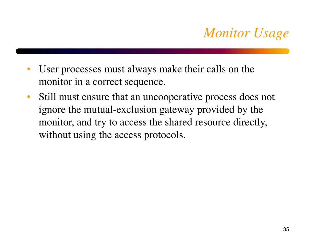 Monitor Usage • User processes must always make their calls on the monitor in a correct sequence. • Still must ensure that an uncooperative process does not ignore the mutual-exclusion gateway provided by the monitor, and try to access the shared resource directly, without using the access protocols.