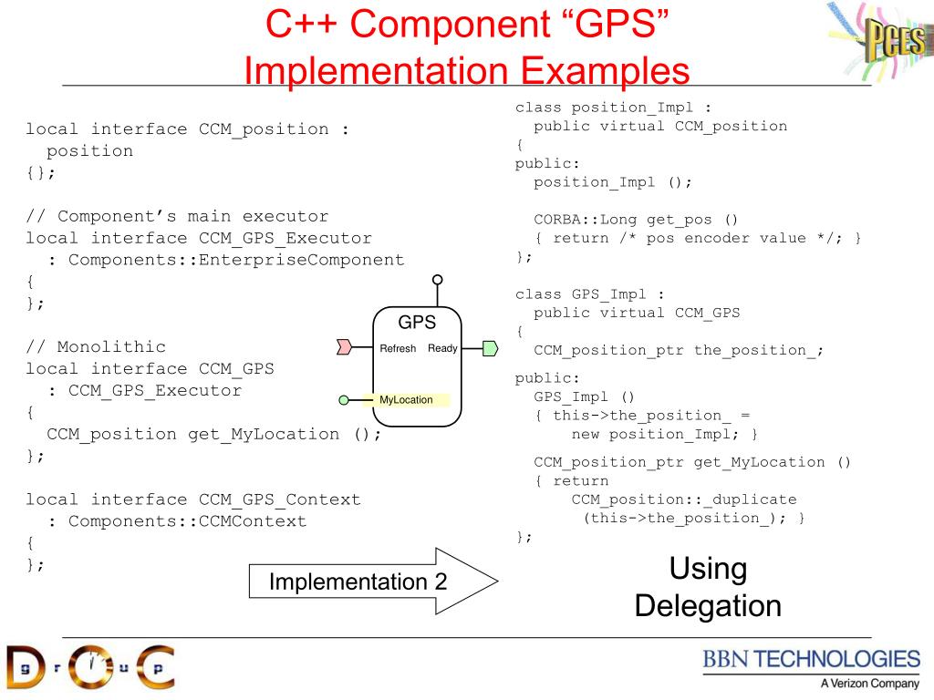 C++ Component “GPS”Implementation Examples local interface CCM_position : position {}; // Component’s main executor local interface CCM_GPS_Executor : Components::EnterpriseComponent { }; // Monolithic local interface CCM_GPS : CCM_GPS_Executor { CCM_position get_MyLocation (); }; local interface CCM_GPS_Context : Components::CCMContext { }; class position_Impl : public virtual CCM_position{public: position_Impl (); CORBA::Long get_pos () { return /* pos encoder value */; }};class GPS_Impl : public virtual CCM_GPS, public virtual position_Impl{public: CCM_position_ptr get_MyLocation () { return CCM_position::_duplicate (this); }}; Using Inheritance Implementation 1