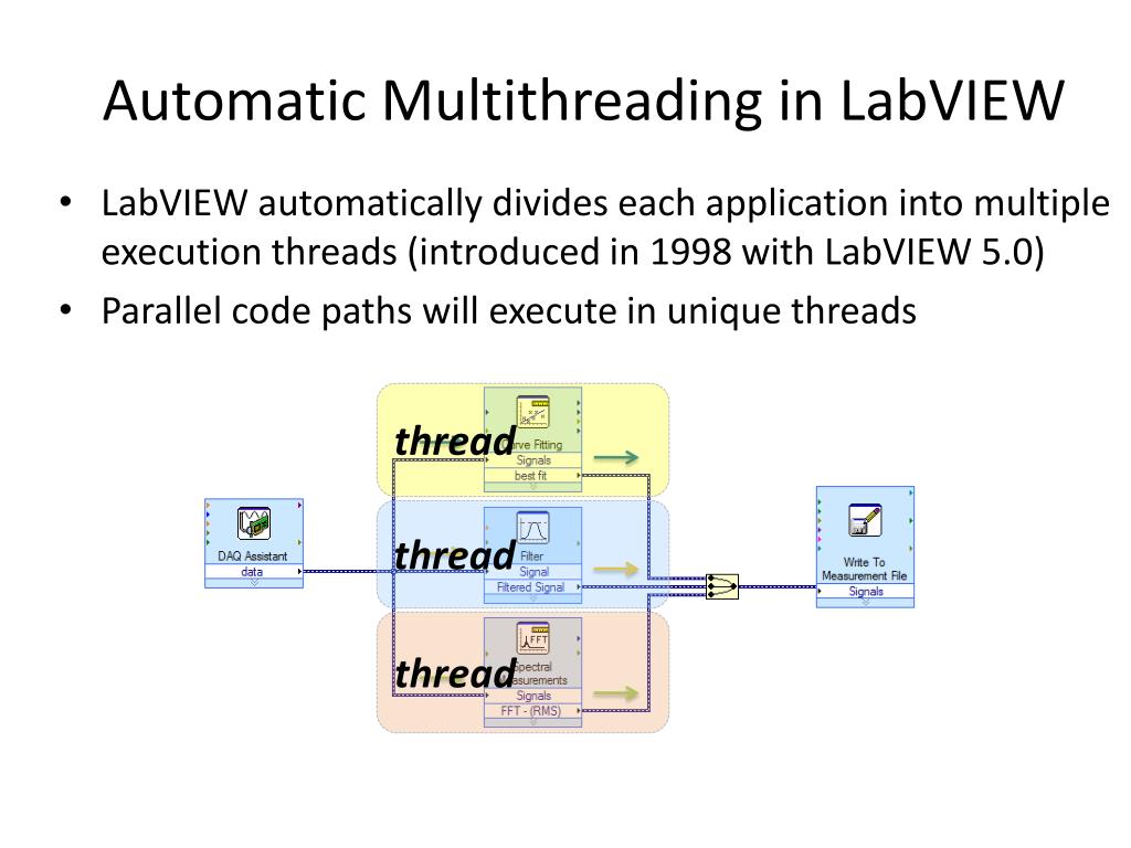 Automatic Multithreading in LabVIEW • LabVIEW automatically divides each application into multiple execution threads (introduced in 1998 with LabVIEW 5.0) • Parallel code paths will execute in unique threads thread thread thread