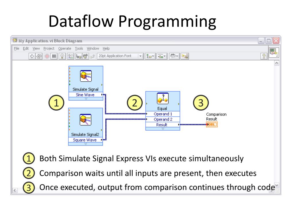 Dataflow Programming Block Diagram 1 2 3 Both Simulate Signal Express VIs execute simultaneously 1 Comparison waits until all inputs are present, then executes 2 Once executed, output from comparison continues through code 3