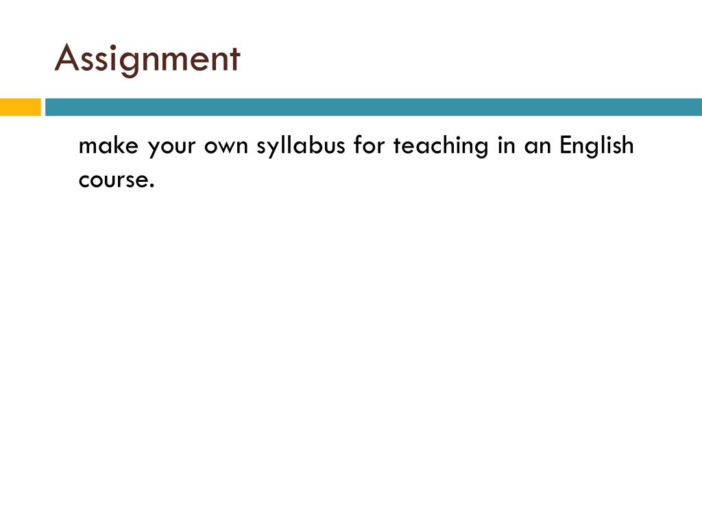 What is syllabus? • A syllabus is simply an outline and time line of a particular course. It will typically give a brief overview of the course objectives, course expectations, list reading assignments, homework deadlines, and exam dates. • A syllabus is a document which consist, essentially, of list. This list specifies all the things that are to be taught in the course. ( Penny Ur, 1998)
