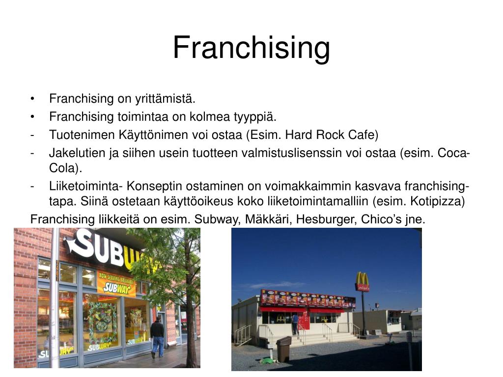 Franchising • Franchising on yrittämistä. • Franchising toimintaa on kolmea tyyppiä. • Tuotenimen Käyttönimen voi ostaa (Esim. Hard Rock Cafe) • Jakelutien ja siihen usein tuotteen valmistuslisenssin voi ostaa (esim. Coca-Cola). • Liiketoiminta- Konseptin ostaminen on voimakkaimmin kasvava franchising- tapa. Siinä ostetaan käyttöoikeus koko liiketoimintamalliin (esim. Kotipizza) Franchising liikkeitä on esim. Subway, Mäkkäri, Hesburger, Chico’s jne.