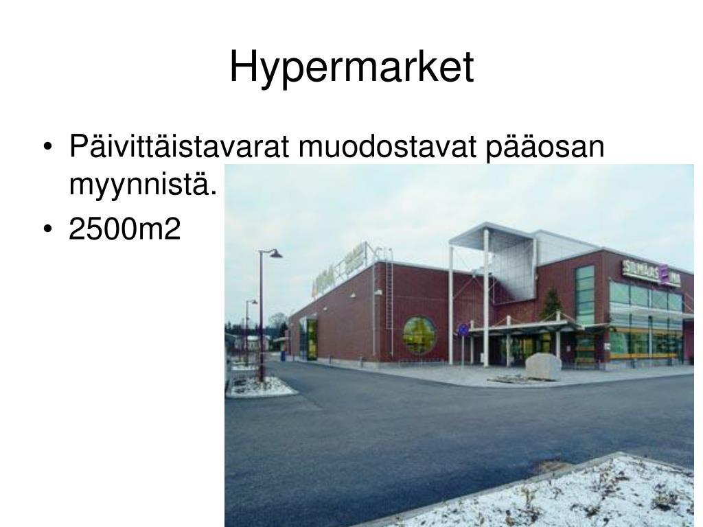 Hypermarket • Päivittäistavarat muodostavat pääosan myynnistä. • 2500m2