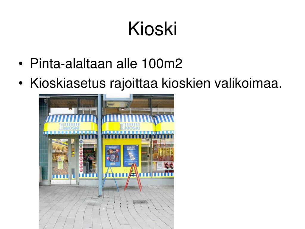 Kioski • Pinta-alaltaan alle 100m2 • Kioskiasetus rajoittaa kioskien valikoimaa.