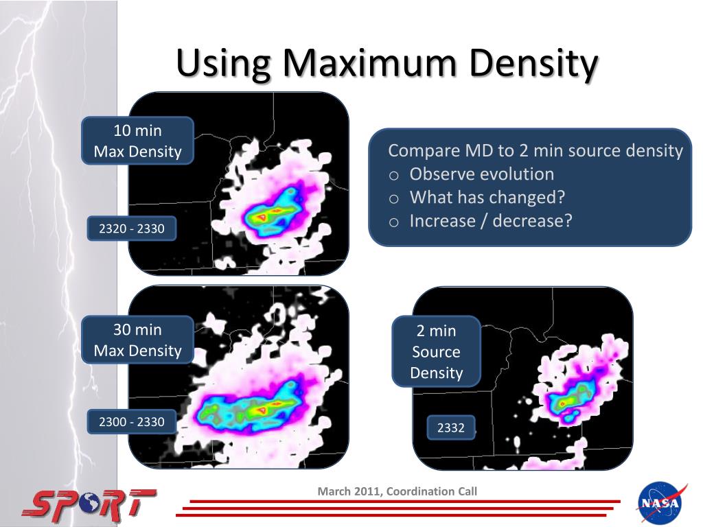 Existing Training • Focus on Source Densities • Basic product in AWIPS • Background on total lightning • Part of the NOAA Learning Management System http://weather.msfc.nasa.gov/sport/training/ March 2011, Coordination Call
