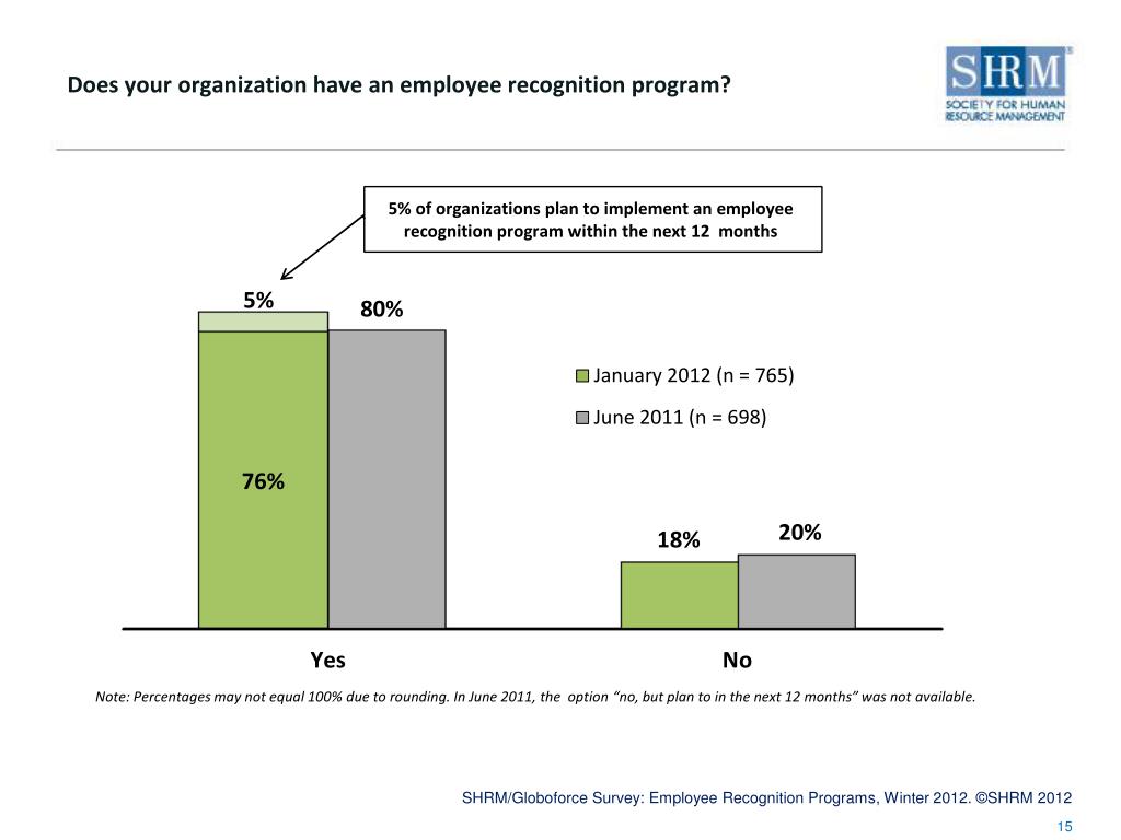 SHRM Survey Findings: Employee Recognition ProgramsIn collaboration with and commissioned by Globoforce • Response rate = 13% • Sample composed of 770 randomly selected HR professionals from SHRM’s membership who are employed at organizations with a staff size of 500 or more employees. • Margin of error is +/- 3% • Survey fielded December 22, 2011-January 12, 2012 Methodology: • For more poll findings, visit www.shrm.org/surveys • Follow us on Twitter: http://twitter.com/SHRM_Research