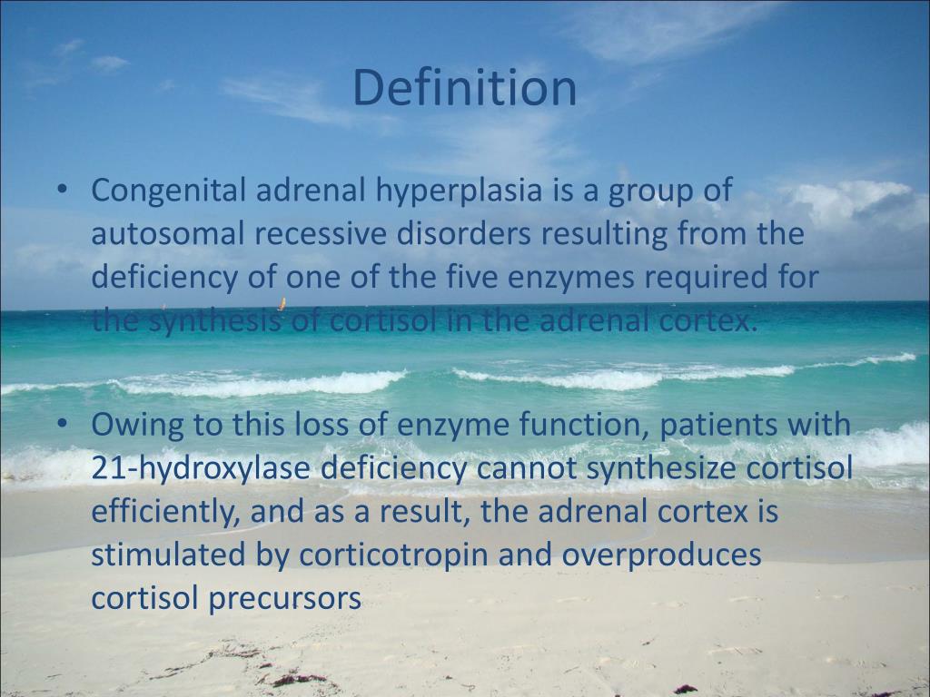 Definition • Congenital adrenal hyperplasia is a group of autosomal recessive disorders resulting from the deficiency of one of the five enzymes required for the synthesis of cortisol in the adrenal cortex. • Owing to this loss of enzyme function, patients with 21-hydroxylase deficiency cannot synthesize cortisol efficiently, and as a result, the adrenal cortex is stimulated by corticotropin and overproduces cortisol precursors