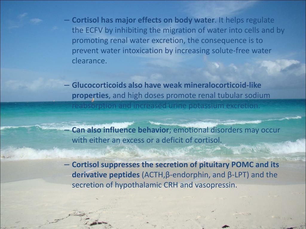 Cortisol has major effects on body water. It helps regulate the ECFV by inhibiting the migration of water into cells and by promoting renal water excretion, the consequence is to prevent water intoxication by increasing solute-free water clearance. • Glucocorticoids also have weak mineralocorticoid-like properties, and high doses promote renal tubular sodium reabsorption and increased urine potassium excretion. • Can also influence behavior; emotional disorders may occur with either an excess or a deficit of cortisol. • Cortisol suppresses the secretion of pituitary POMC and its derivative peptides (ACTH,β-endorphin, and β-LPT) and the secretion of hypothalamic CRH and vasopressin.