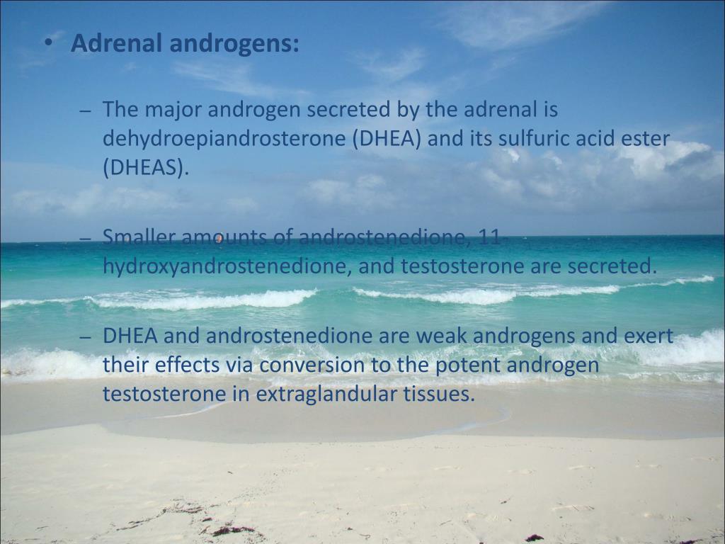 Adrenal androgens: • The major androgen secreted by the adrenal is dehydroepiandrosterone (DHEA) and its sulfuric acid ester (DHEAS). • Smaller amounts of androstenedione, 11-hydroxyandrostenedione, and testosterone are secreted. • DHEA and androstenedione are weak androgens and exert their effects via conversion to the potent androgen testosterone in extraglandular tissues.
