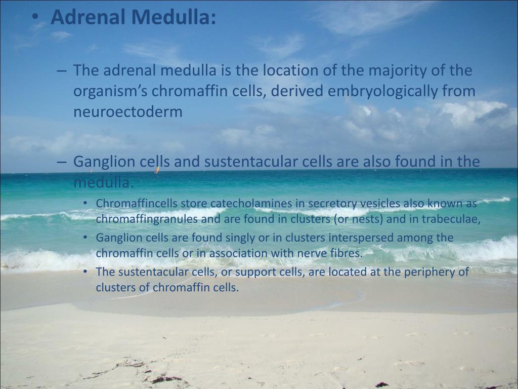 Adrenal Medulla: • The adrenal medulla is the location of the majority of the organism’s chromaffin cells, derived embryologically from neuroectoderm • Ganglion cells and sustentacular cells are also found in the medulla. • Chromaffincells store catecholamines in secretory vesicles also known as chromaffingranules and are found in clusters (or nests) and in trabeculae, • Ganglion cells are found singly or in clusters interspersed among the chromaffin cells or in association with nerve fibres. • The sustentacular cells, or support cells, are located at the periphery of clusters of chromaffin cells.