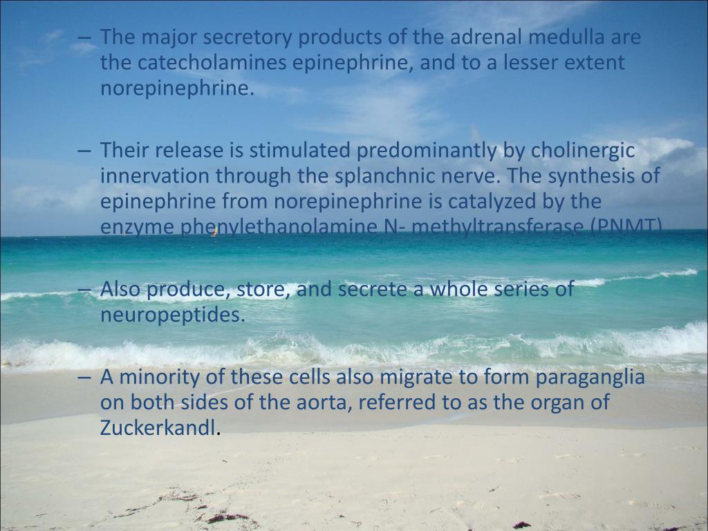 The major secretory products of the adrenal medulla are the catecholamines epinephrine, and to a lesser extent norepinephrine. • Their release is stimulated predominantly by cholinergic innervation through the splanchnic nerve. The synthesis of epinephrine from norepinephrine is catalyzed by the enzyme phenylethanolamine N- methyltransferase (PNMT) • Also produce, store, and secrete a whole series of neuropeptides. • A minority of these cells also migrate to form paraganglia on both sides of the aorta, referred to as the organ of Zuckerkandl.