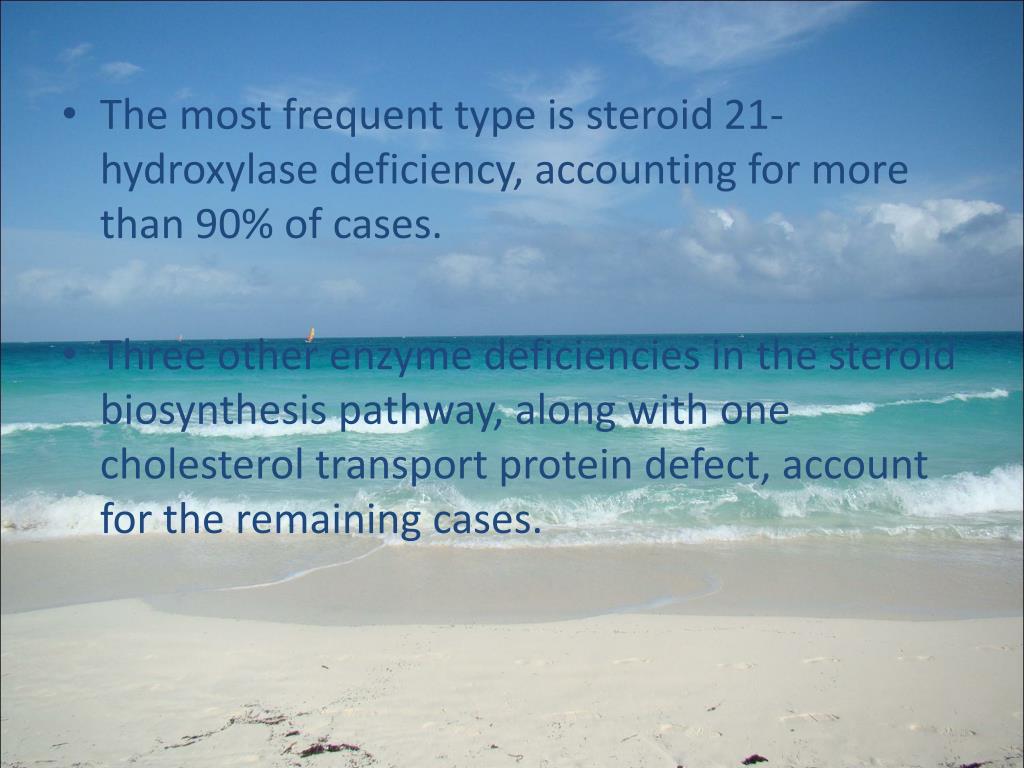 The most frequent type is steroid 21-hydroxylase deficiency, accounting for more than 90% of cases. • Three other enzyme deficiencies in the steroid biosynthesis pathway, along with one cholesterol transport protein defect, account for the remaining cases.