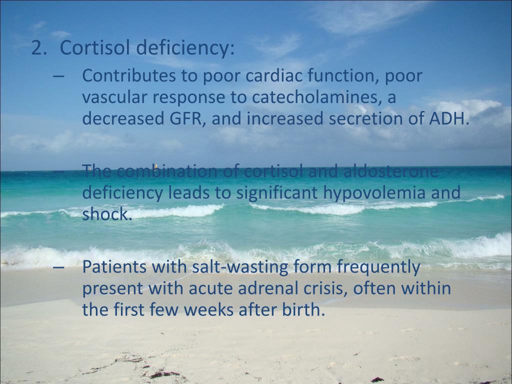 Cortisol deficiency: • contributes to poor cardiac function, poor vascular response to catecholamines, a decreased GFR, and increased secretion of ADH. • The combination of cortisol and aldosterone deficiency leads to significant hypovolemia and shock. • Patients with salt-wasting form frequently present with acute adrenal crisis, often within the first few weeks after birth.