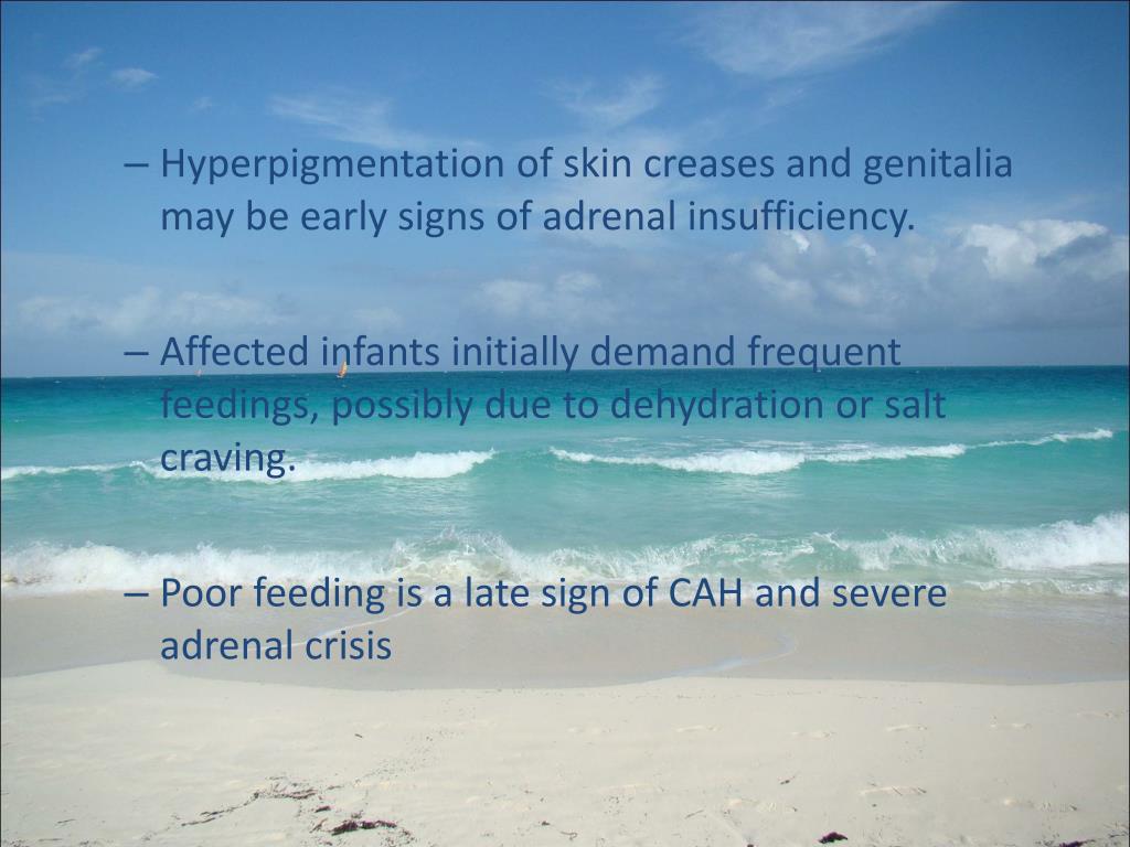 Hyperpigmentation of skin creases and genitalia may be early signs of adrenal insufficiency. • Affected infants initially demand frequent feedings, possibly due to dehydration or salt craving. • Poor feeding is a late sign of CAH and severe adrenal crisis