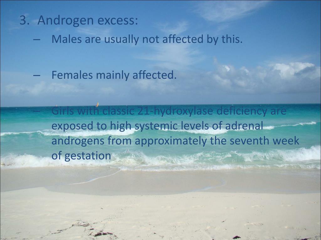 Androgen excess: • Males are usually not affected by this. • Females mainly affected. • Girls with classic 21-hydroxylase deficiency are exposed to high systemic levels of adrenal androgens from approximately the seventh week of gestation
