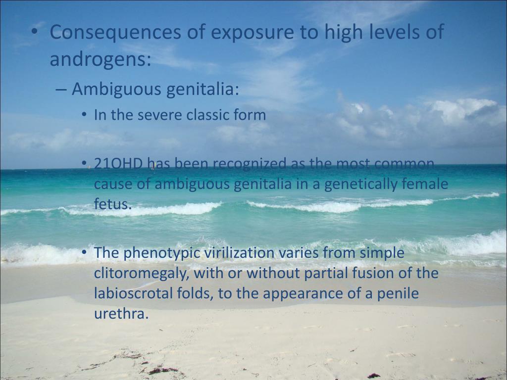 Consequences of exposure to high levels of androgens: • Ambiguous genitalia: • In the severe classic form • 21OHD has been recognized as the most common cause of ambiguous genitalia in a genetically female fetus. • The phenotypic virilization varies from simple clitoromegaly, with or without partial fusion of the labioscrotal folds, to the appearance of a penile urethra.