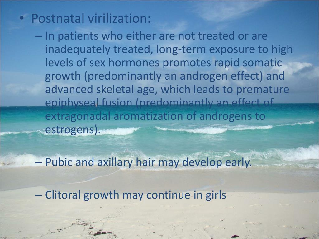 Postnatal virilization: • In patients who either are not treated or are inadequately treated, long-term exposure to high levels of sex hormones promotes rapid somatic growth (predominantly an androgen effect) and advanced skeletal age, which leads to premature epiphyseal fusion (predominantly an effect of extragonadal aromatization of androgens to estrogens). • Pubic and axillary hair may develop early. • Clitoral growth may continue in girls