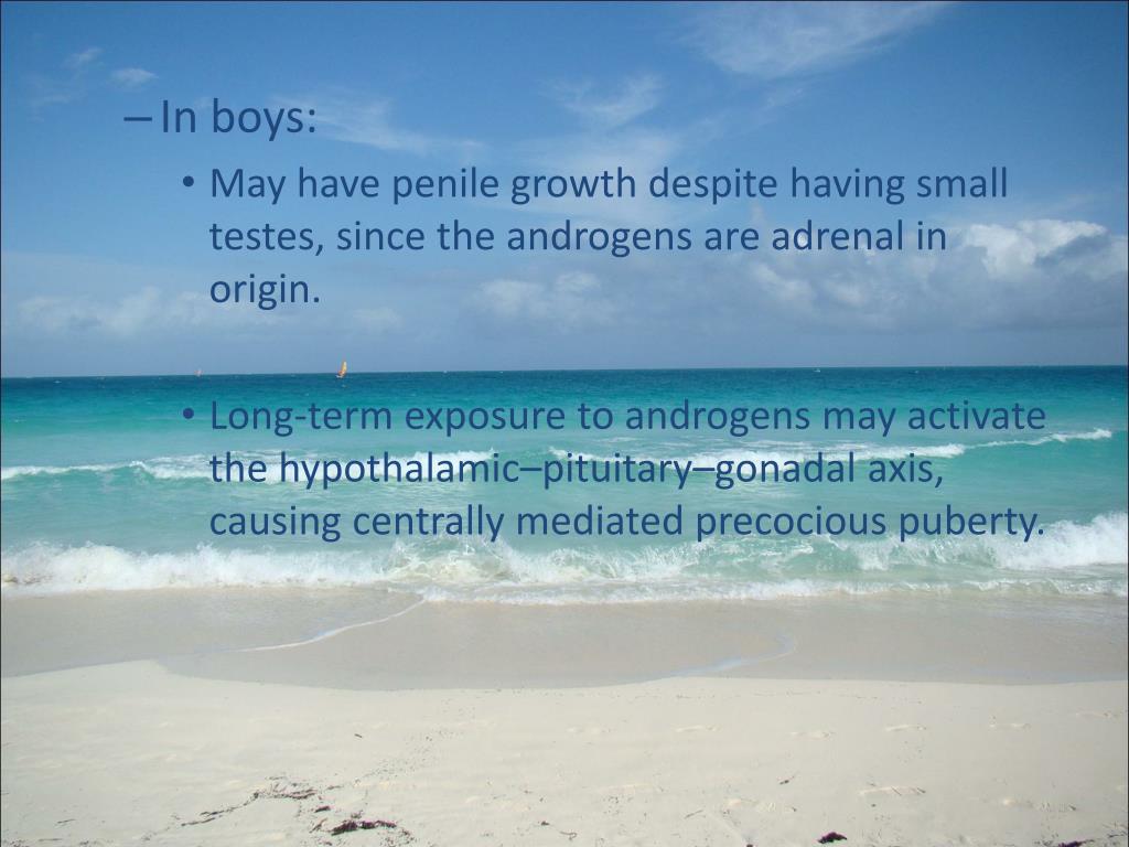 In boys: • May have penile growth despite having small testes, since the androgens are adrenal in origin. • Long-term exposure to androgens may activate the hypothalamic–pituitary–gonadal axis, causing centrally mediated precocious puberty.