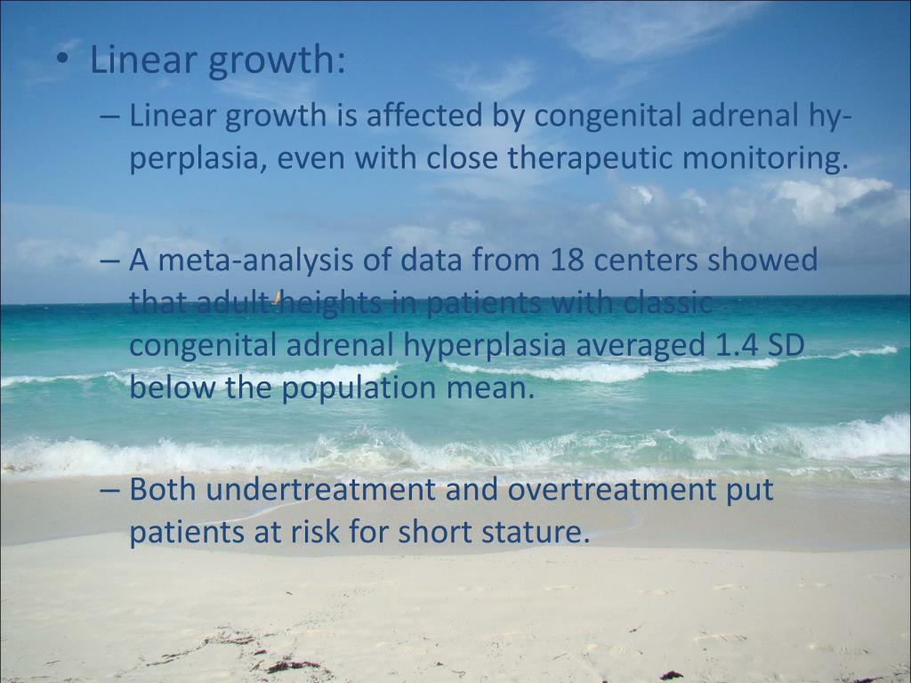 Linear growth: • Linear growth is affected by congenital adrenal hy- perplasia, even with close therapeutic monitoring. • A meta-analysis of data from 18 centers showed that adult heights in patients with classic congenital adrenal hyperplasia averaged 1.4 SD below the population mean. • Both undertreatment and overtreatment put patients at risk for short stature.
