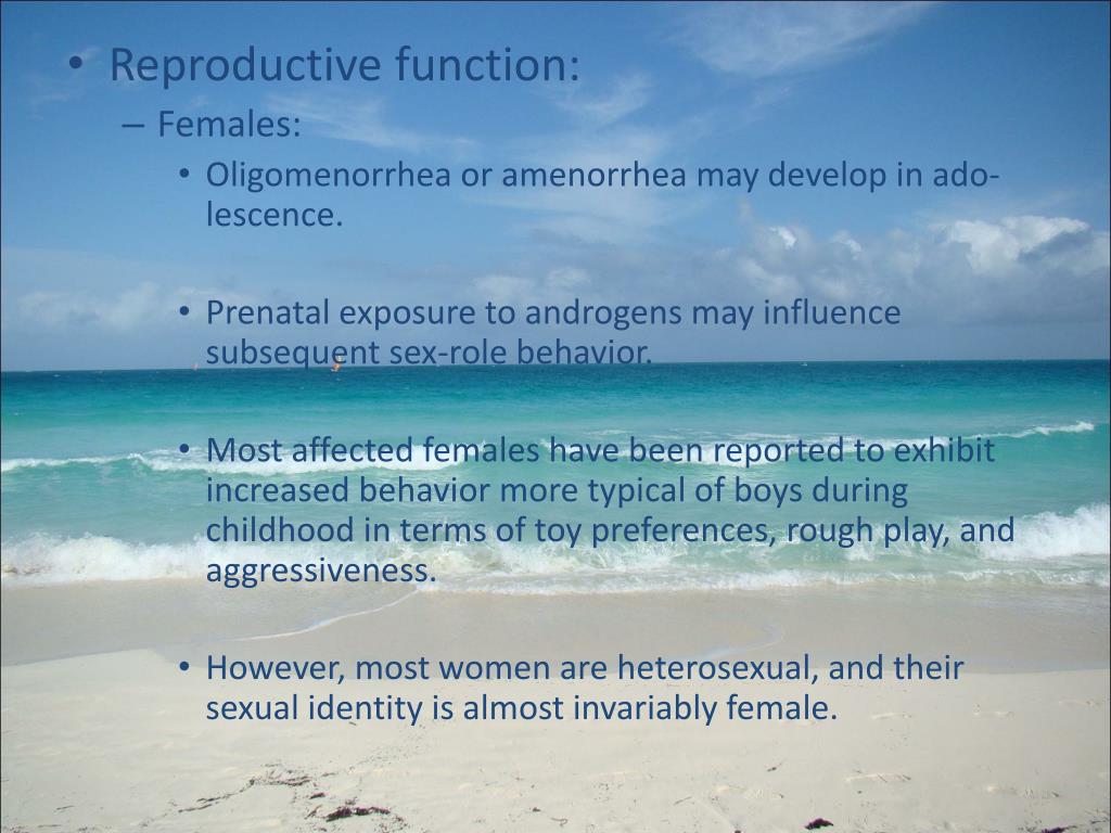Reproductive function: • Females: • Oligomenorrhea or amenorrhea may develop in ado-lescence. • Prenatal exposure to androgens may influence subsequent sex-role behavior. • Most affected females have been reported to exhibit increased behavior more typical of boys during childhood in terms of toy preferences, rough play, and aggressiveness. • However, most women are heterosexual, and their sexual identity is almost invariably female.