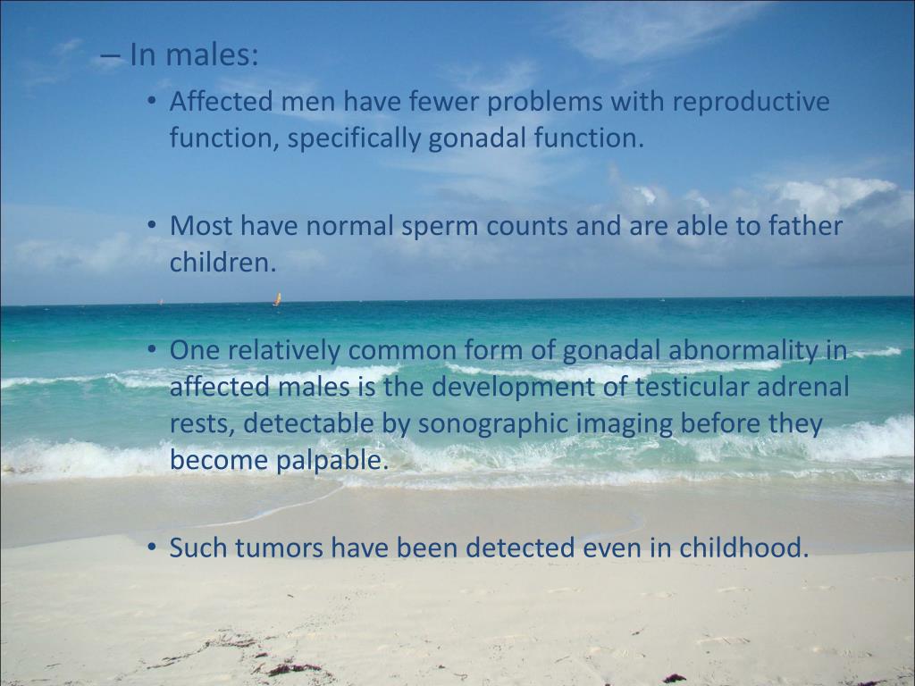In males: • Affected men have fewer problems with reproductive function, specifically gonadal function. • Most have normal sperm counts and are able to father children. • One relatively common form of gonadal abnormality in affected males is the development of testicular adrenal rests, detectable by sonographic imaging before they become palpable. • Such tumors have been detected even in childhood.