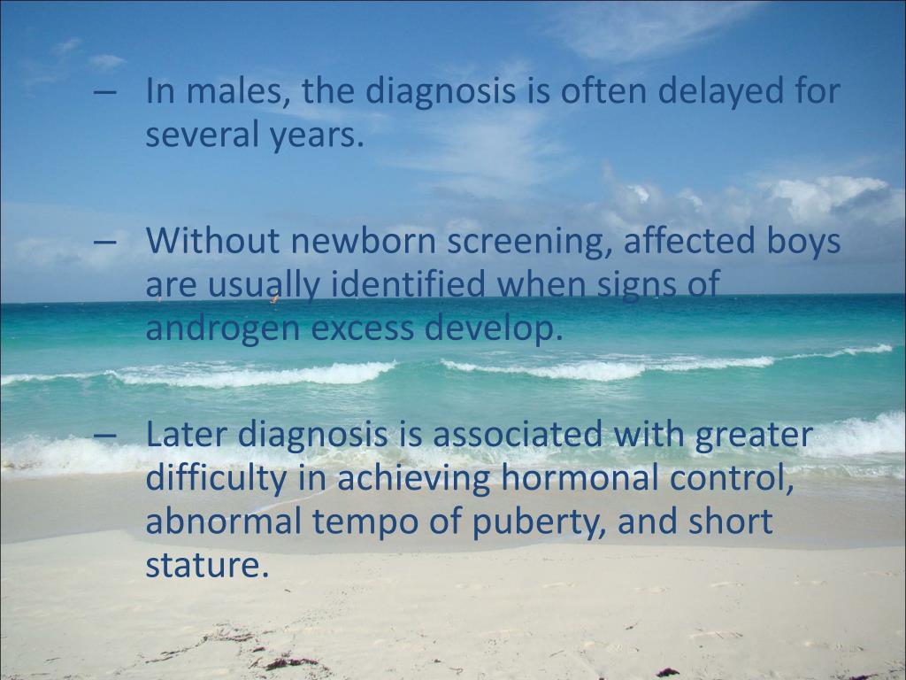 In males, the diagnosis is often delayed for several years. • Without newborn screening, affected boys are usually identified when signs of androgen excess develop. • Later diagnosis is associated with greater difficulty in achieving hormonal control, abnormal tempo of puberty, and short stature.