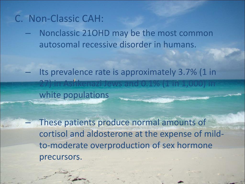 Non-Classic CAH: • Nonclassic 21OHD may be the most common autosomal recessive disorder in humans. • Its prevalence rate is approximately 3.7% (1 in 27) in Ashkenazi Jews and 0.1% (1 in 1,000) in white populations • These patients produce normal amounts of cortisol and aldosterone at the expense of mild-to-moderate overproduction of sex hormone precursors.