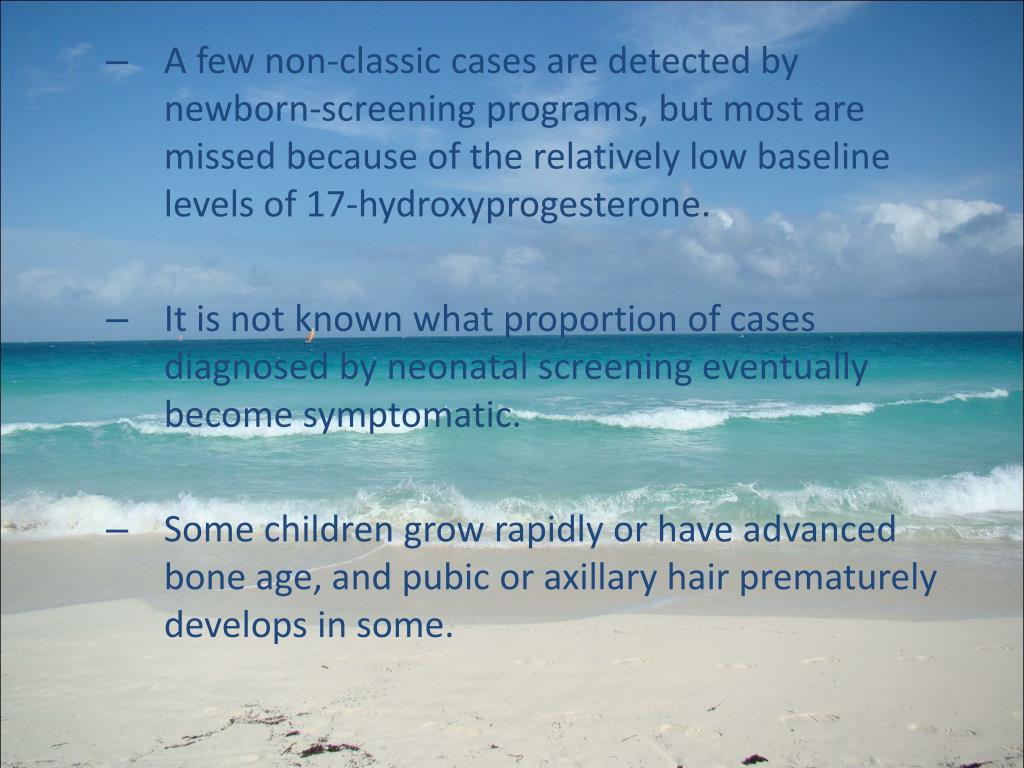 A few non-classic cases are detected by newborn-screening programs, but most are missed because of the relatively low baseline levels of 17-hydroxyprogesterone. • It is not known what proportion of cases diagnosed by neonatal screening eventually become symptomatic. • Some children grow rapidly or have advanced bone age, and pubic or axillary hair prematurely develops in some.