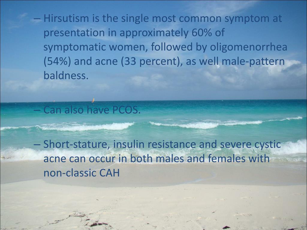 Hirsutism is the single most common symptom at presentation in approximately 60% of symptomatic women, followed by oligomenorrhea (54%) and acne (33 percent), as well male-pattern baldness. • Can also have PCOS. • Short-stature, insulin resistance and severe cystic acne can occur in both males and females with non-classic CAH