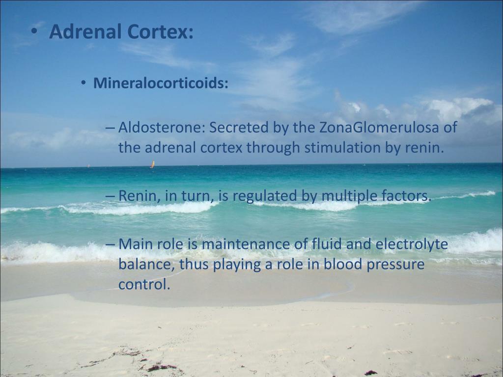 Adrenal Cortex: • Mineralocorticoids: • Aldosterone: Secreted by the ZonaGlomerulosa of the adrenal cortex through stimulation by renin. • Renin, in turn, is regulated by multiple factors. • Main role is maintenance of fluid and electrolyte balance, thus playing a role in blood pressure control.