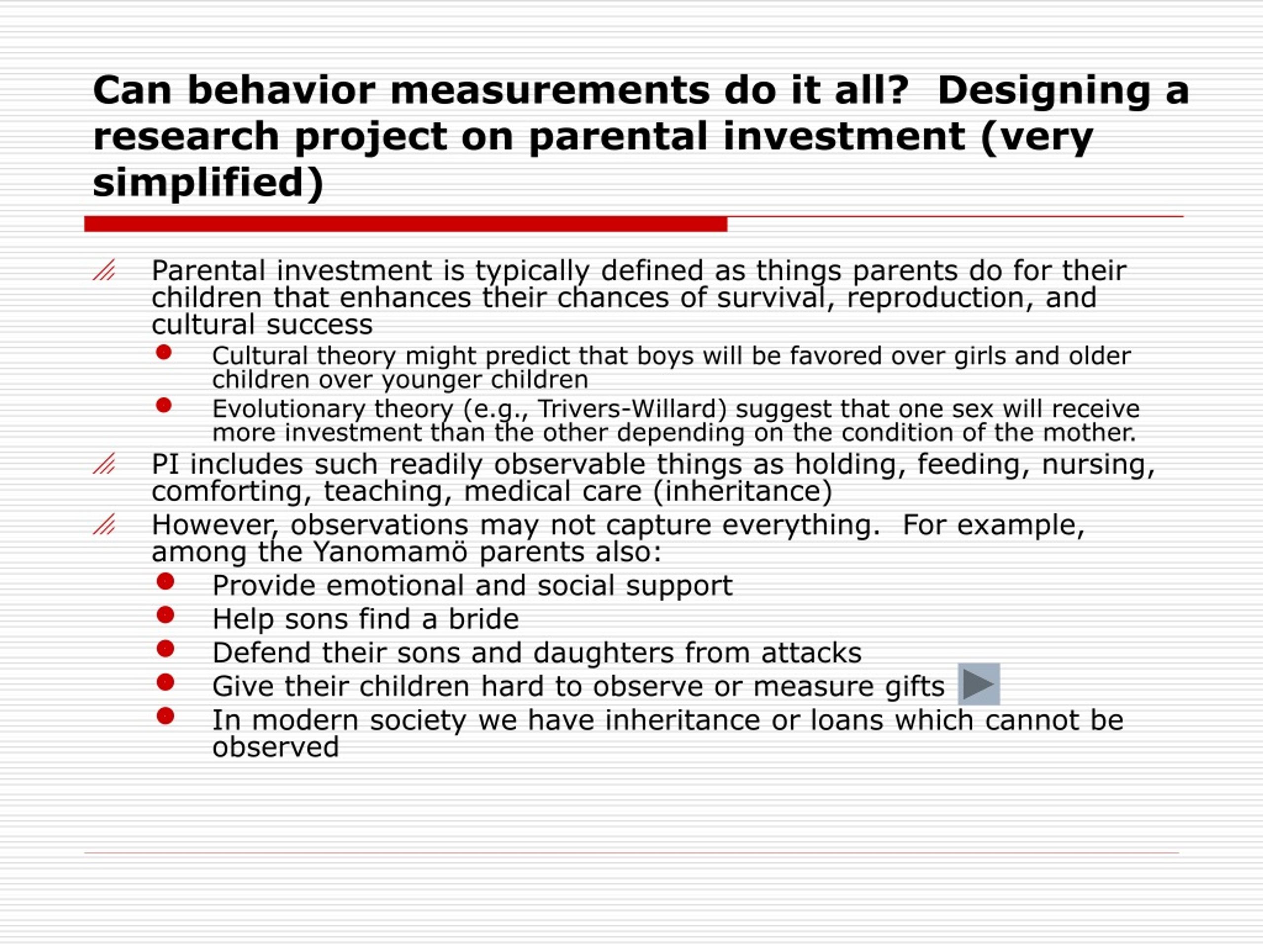 Can behavior measurements do it all? Designing a research project on parental investment (very simplified) • Parental investment is typically defined as things parents do for their children that enhances their chances of survival, reproduction, and cultural success • Cultural theory might predict that boys will be favored over girls and older children over younger children • Evolutionary theory (e.g., Trivers-Willard) suggest that one sex will receive more investment than the other depending on the condition of the mother. • PI includes such readily observable things as holding, feeding, nursing, comforting, teaching, medical care (inheritance) • However, observations may not capture everything. For example, among the Yanomamö parents also: • Provide emotional and social support • Help sons find a bride • Defend their sons and daughters from attacks • Give their children hard to observe or measure gifts • In modern society we have inheritance or loans which cannot be observed