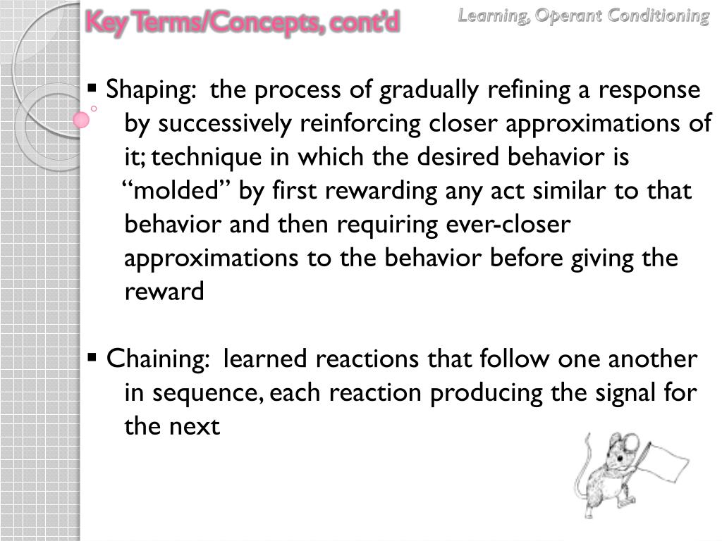 Key Terms/Concepts, cont’d • Shaping: the process of gradually refining a response • by successively reinforcing closer approximations of • it; technique in which the desired behavior is • “molded” by first rewarding any act similar to that • behavior and then requiring ever-closer • approximations to the behavior before giving the • reward • Chaining: learned reactions that follow one another • in sequence, each reaction producing the signal for • the next Learning, Operant Conditioning
