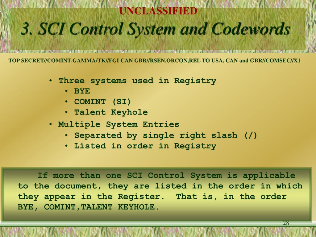 3. SCI Control System and Codewords TOP SECRET//COMINT-GAMMA/TK//FGI CAN GBR//RSEN,ORCON,REL TO USA, CAN and GBR//COMSEC//X1 • Three systems used in Registry • BYE • COMINT (SI) • Talent Keyhole • Multiple System Entries • Separated by single right slash (/) • Listed in order in Registry The next category of information is the Sensitive Compartmented Information (SCI) Control Systems/Codewords category. An SCI Control System is the system of procedural protective mechanisms used to regulate or guide each program established by the DCI as SCI. A Control System provides the ability to exercise restraint, direction, or influence over or provide that degree of access control or physical protection necessary to regulate, handle or manage information or items within an approved program. The three SCI Control Systems included in the register are: BYE, COMINT and TALENT KEYHOLE.