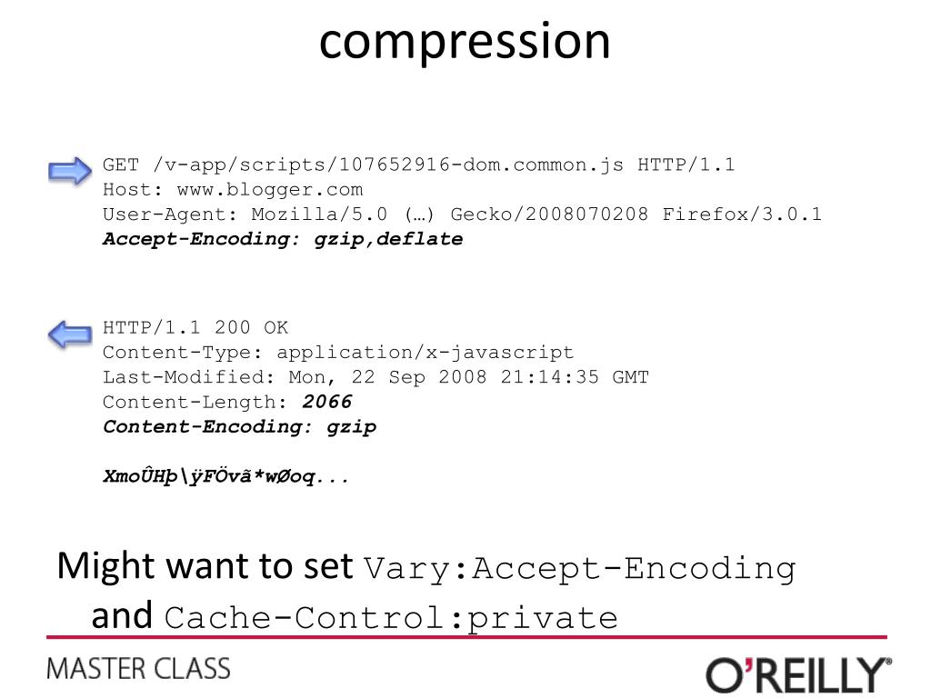 compression Might want to set Vary:Accept-Encoding and Cache-Control:private GET /v-app/scripts/107652916-dom.common.js HTTP/1.1 Host: www.blogger.com User-Agent: Mozilla/5.0 (…) Gecko/2008070208 Firefox/3.0.1 GET /v-app/scripts/107652916-dom.common.js HTTP/1.1 Host: www.blogger.com User-Agent: Mozilla/5.0 (…) Gecko/2008070208 Firefox/3.0.1 Accept-Encoding: gzip,deflate HTTP/1.1 200 OK Content-Type: application/x-javascript Last-Modified: Mon, 22 Sep 2008 21:14:35 GMT Content-Length: 6230 function d(s) {... HTTP/1.1 200 OK Content-Type: application/x-javascript Last-Modified: Mon, 22 Sep 2008 21:14:35 GMT Content-Length: 2066 Content-Encoding: gzip XmoÛHþ\ÿFÖvã*wØoq...