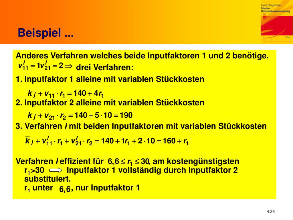Falls anstelle des Inputfaktors 1 auch ein anderer Inputfaktor 2 mitr2 =10 (Substitution) und v21 = 5 Einheiten verwendet werden kann Bei Preis über 12,5 ist es kostengünstiger, den Inputfaktor 2 anstelle von 1 zu verwenden Beispiel Das Produkt 1 benötigt v11 = 4 Einheiten des Inputfaktors 1; der Absatzpreis beträgt p1 = 200, variable Stückkosten ohne die Kosten des Inputfaktors .