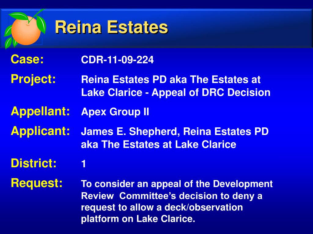 Reina Estates Case: CDR-11-09-224 Project: Reina Estates PD aka The Estates at Lake Clarice - Appeal of DRC Decision Appellant:Apex Group II Applicant:James E. Shepherd, Reina Estates PD aka The Estates at Lake Clarice District: 1 Request: To consider an appeal of the Development Review Committee’s decision to deny a request to allow a deck/observation platform on Lake Clarice.
