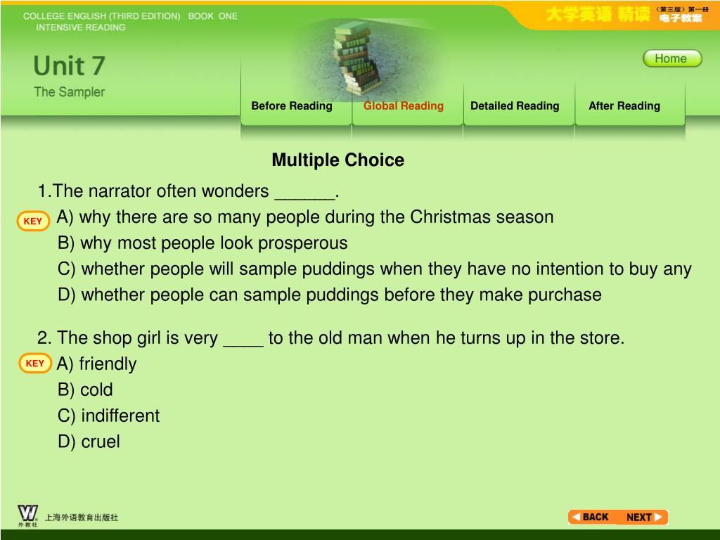 KEY KEY Globe Reading.2-part1.2 Before Reading Global Reading Detailed Reading After Reading Multiple Choice 1.The narrator often wonders ______. A) why there are so many people during the Christmas season B) why most people look prosperous C) whether people will sample puddings when they have no intention to buy any D) whether people can sample puddings before they make purchase 2. The shop girl is very ____ to the old man when he turns up in the store. A) friendly B) cold C) indifferent D) cruel