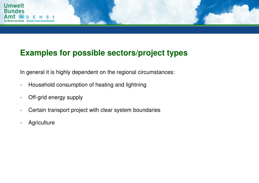 Examples for possible sectors/project types • In general it is highly dependent on the regional circumstances: • Household consumption of heating and lightning • Off-grid energy supply • Certain transport project with clear system boundaries • Agriculture