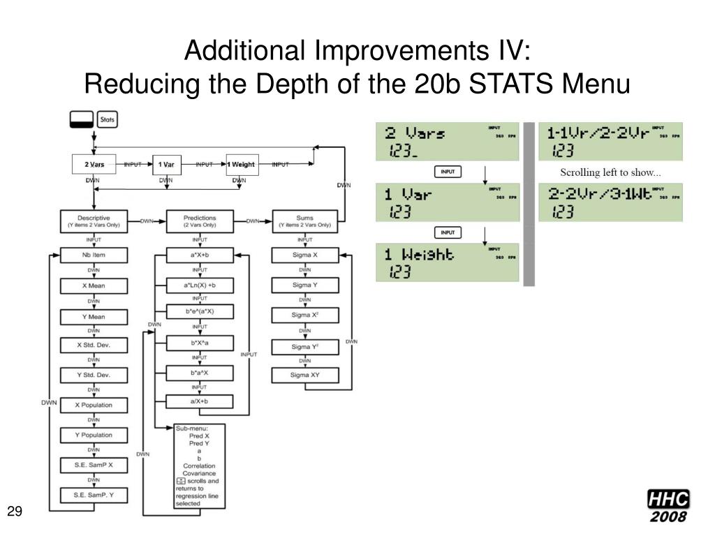Summary of 20b Improvements • Addition of a second shift key and shifted key plane above the physical keys • Removal of ten soft-key menus and submenus with their functions moved out onto the keyboard. Positioning of related function keys from the same menu in proximity to each other, with keyboard markings showing their relationship. • Adding highlighting borders around all keyboard markings which activate menus. • Reduction of depth of STATS menu tree via a “counted” menu (a la 35S) at the top