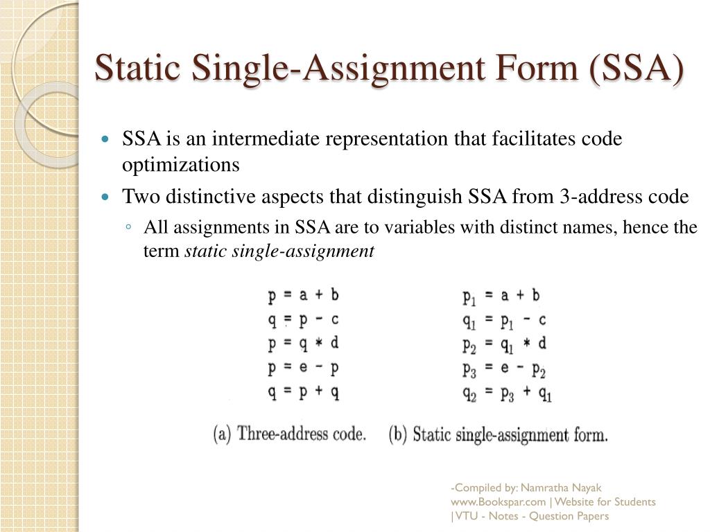 Static Single-Assignment Form (SSA) • SSA is an intermediate representation that facilitates code optimizations • Two distinctive aspects that distinguish SSA from 3-address code • All assignments in SSA are to variables with distinct names, hence the term static single-assignment -Compiled by: Namratha Nayak www.Bookspar.com | Website for Students | VTU - Notes - Question Papers
