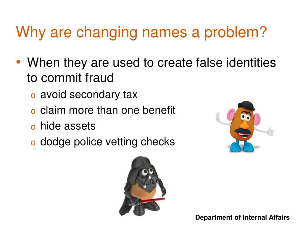 Why are changing names a problem? • When they are used to create false identities to commit fraud • avoid secondary tax • claim more than one benefit • hide assets • dodge police vetting checks