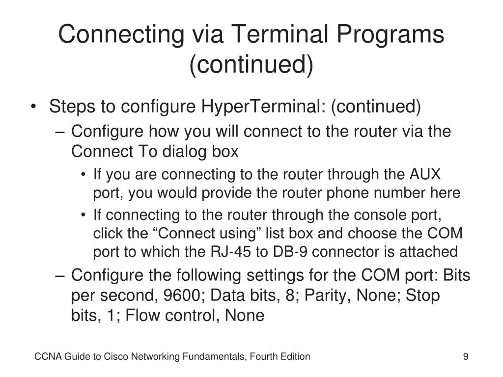 Connecting via Terminal Programs • When configuring the router through the console or AUX ports • You must first make the physical connection • Then, you can access the router through a terminal program • Steps to configure HyperTerminal: • Open the HyperTerminal application • Click File on the menu bar, and then click New Connection • Enter a name for the connection CCNA Guide to Cisco Networking Fundamentals, Fourth Edition