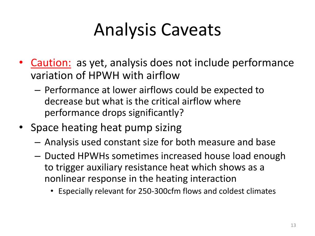 Analysis Caveats • Caution:as yet, analysis does not include performance variation of HPWH with airflow • Performance at lower airflows could be expected to decrease but what is the critical airflow where performance drops significantly? • Space heating heat pump sizing • Analysis used constant size for both measure and base • Ducted HPWHs sometimes increased house load enough to trigger auxiliary resistance heat which shows as a nonlinear response in the heating interaction • Especially relevant for 250-300cfm flows and coldest climates