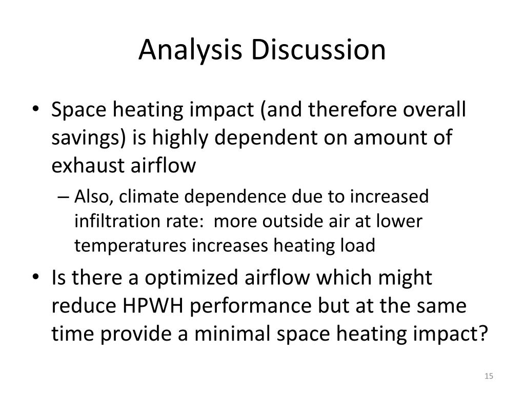 Analysis Discussion • Space heating impact (and therefore overall savings) is highly dependent on amount of exhaust airflow • Also, climate dependence due to increased infiltration rate: more outside air at lower temperatures increases heating load • Is there a optimized airflow which might reduce HPWH performance but at the same time provide a minimal space heating impact?
