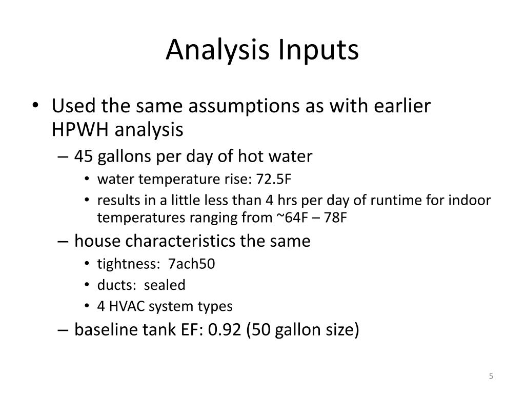 Analysis Inputs • Used the same assumptions as with earlier HPWH analysis • 45 gallons per day of hot water • water temperature rise: 72.5F • results in a little less than 4 hrs per day of runtime for indoor temperatures ranging from ~64F – 78F • house characteristics the same • tightness: 7ach50 • ducts: sealed • 4 HVAC system types • baseline tank EF: 0.92 (50 gallon size)