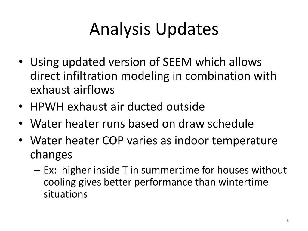 Analysis Updates • Using updated version of SEEM which allows direct infiltration modeling in combination with exhaust airflows • HPWH exhaust air ducted outside • Water heater runs based on draw schedule • Water heater COP varies as indoor temperature changes • Ex: higher inside T in summertime for houses without cooling gives better performance than wintertime situations