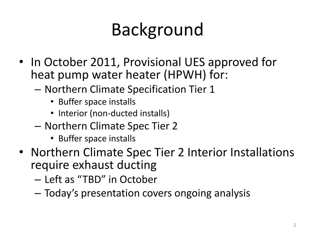 Background • In October 2011, Provisional UES approved for heat pump water heater (HPWH) for: • Northern Climate Specification Tier 1 • Buffer space installs • Interior (non-ducted installs) • Northern Climate Spec Tier 2 • Buffer space installs • Northern Climate Spec Tier 2 Interior Installations require exhaust ducting • Left as “TBD” in October • Today’s presentation covers ongoing analysis